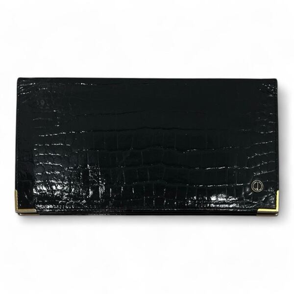 ブラックのエナメルに、立体感のある大きめのクロコ型押しを施した、高級感あふれる長財布です。