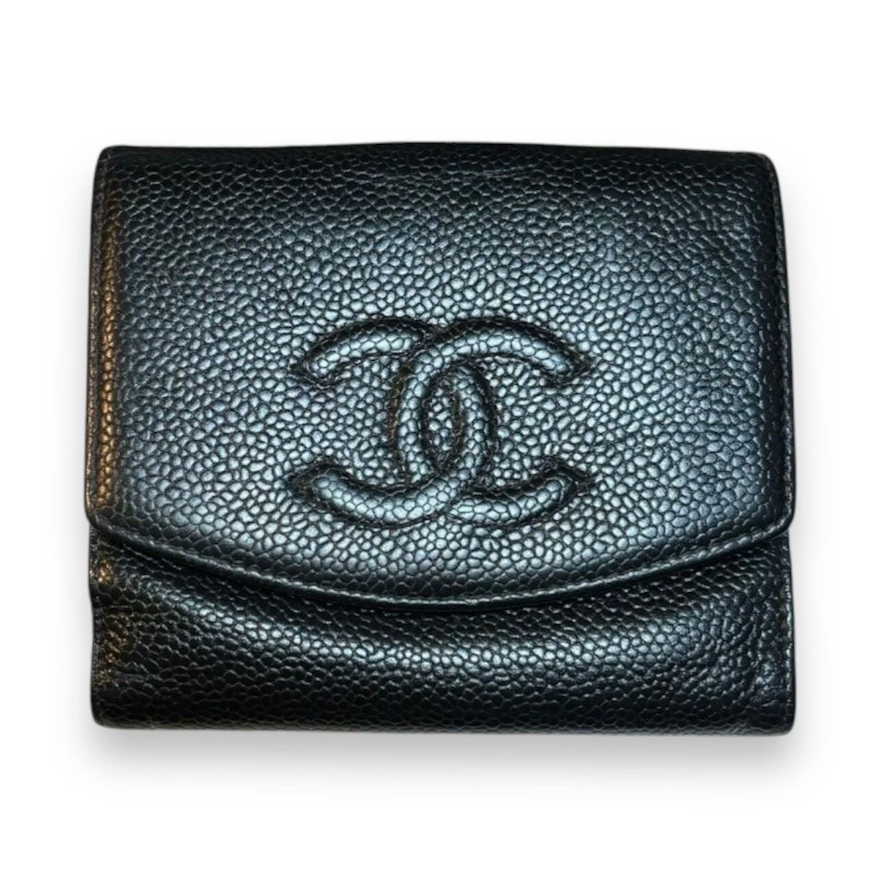 シャネル キャビアスキンの二つ折り財布です。お色はブラックでキャビアスキンがとても高級感がございます。
