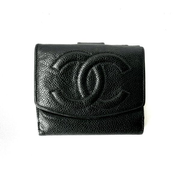 【CHANEL/シャネル】キャビアスキン CC 型押しココマーク Wホック ブラック レディース二つ折り財布